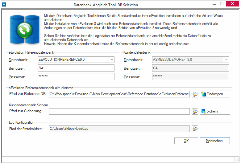 Sie können links in der Feldgruppe eEvolution Referenzdatenbank die eEvolution Referenzdatenbank auswählen. Geben Sie anschließend den Benutzernamen und das Passwort vom Systemadministrator ein.