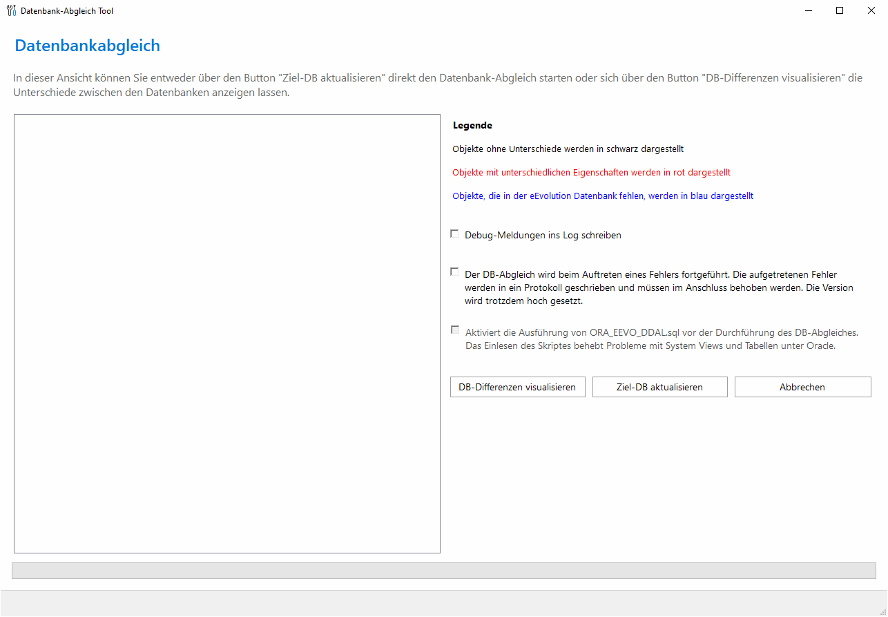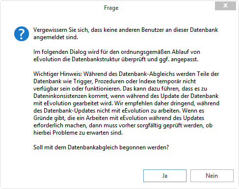 Mit dem Datenbankabgleich können Sie ihre Datenbankstruktur aktualisieren. Bitte beachten Sie in diesem Zusammenhang die unter Datenbankabgleich - Einführung beschriebenen Voraussetzungen und Warnhinweise.