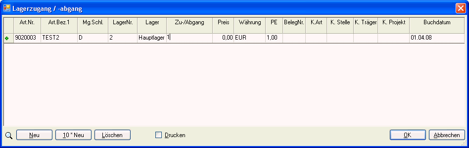 Nehmen Sie in dem Fenster Lagerzugang/-abgangin dem Feld Preis und ggf. BelegNr, K.Art, K.Stelle, K.Träger, K.Projekt die entsprechenden Einträge vor.