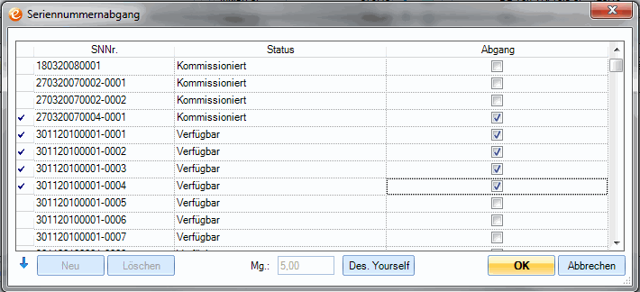 Nach der Eingabe der entsprechenden Anzahl der auszulagernden Seriennummern , im Beispiel 5, öffnet sich das Fenster Seriennummernabgang.