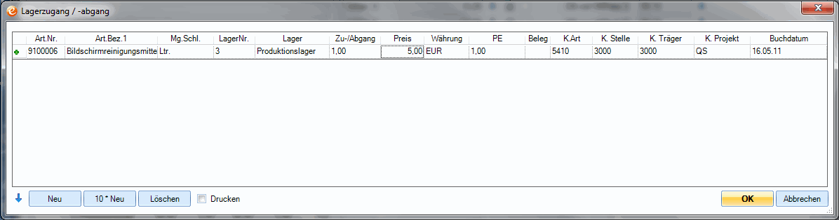 In diese Spalte geben Sie den Lagerzugang bzw. den Lagerabgang ein. Um einen Lagerabgang zu editieren, wird ein negativer Wert eingetragen.