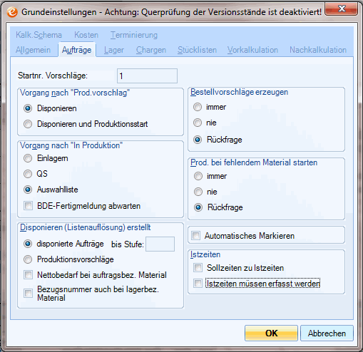Durch Aktivierung dieser Option kann bei fehlenden Teilen im Lager nicht vom Status Disposition in den Status In Produktion gewechselt werden.