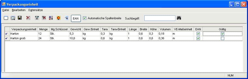 Dem Artikel kann genau eine Verpackungseinheit zugewiesen werden. Dies geschieht durch Setzen der Checkbox in der Spalte Gültig. Die Werte der "gültig" gesetzten Zeile werden