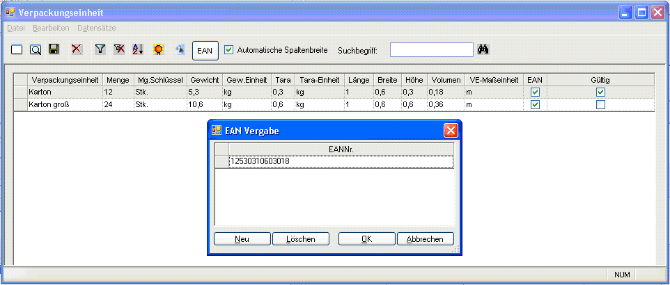 Hierzu wird eine Verpackungseinheit markiert und der Button „EAN“ betätigt.