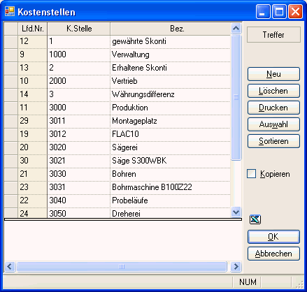 Die Systemtabelle Kostenstellen enthält folgende Spalten: